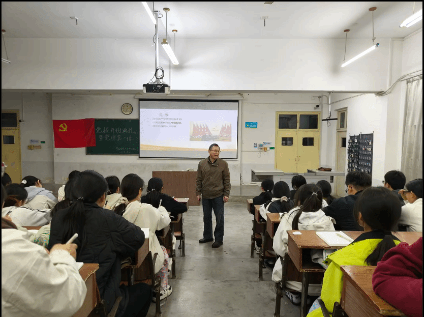 典礼在庄严的国歌声中拉开序幕,现场气氛庄严而热烈。紧接着,新生代表王晨欣同志发表讲话,号召新时代大学生深入学习党的创新理论,坚持理论与实践相结合,以党的理论指导实际行动,解决实际问题;在组织生活和自我管理中不断进步,努力提升思想境界和加强作风建设,以青春之力为中国式现代化建设贡献力量。储杰同志在党课中,带领学员回顾了党的百年历史,深刻阐释了“没有共产党就没有新中国”的历史逻辑和时代意义;系统阐述了中国式现代化的中国特色,特别强调了共同富裕是社会主义的本质要求;同时,引导学员树立正确的入党动机,鼓励大家用理论武装自己,增强党性,以实际行动践行初心,通过奉献彰显人生价值。